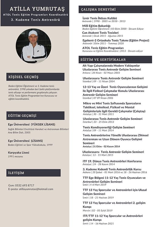 Beden Eğitimi Öğretmeni ve 3. Kademe tenis antrenörü. 1998 yılından beri farklı platformlarda tenis altyapı ve performans gruplarıyla çalışıyor. TUNA Tenis Eğitim Programları'nın Kurucusu ve eğitim koordinatörü.